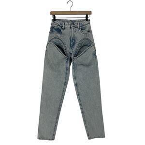 Turn heads with these edgy and glamorous Y/PROJECT Cutout Rhinestone Skinny jeans. Crafted in Portugal, these statement-making high-rise skinnies feature daring front cutouts adorned with crystal embellishments. The sleek silhouette hugs your curves while offering classic 5-pocket styling and a zip fly with button closure. Made from premium cotton with a hint of poly blend, these jeans are perfect for nights out, editorial looks, or elevating your streetwear style with avant-garde appeal. A rare and sought-after piece from the fashion-forward label.