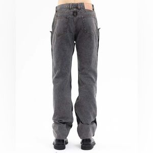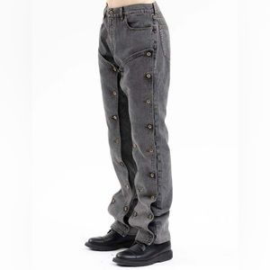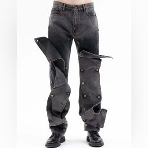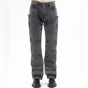 Evergreen snap-panel jeans in faded black, from Y-Project. Regular-fit construction featuring two detachable panels attached to the front legs with silver rivet buttons. Acid washed treatment excluding negative space of the panels creates a two tone effect. Classic five-pocket styling. Contrast stitch detailing. Mid-rise with belt loops and zip-fly fastening.
