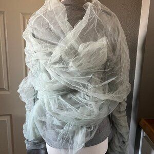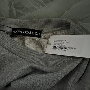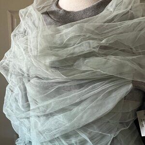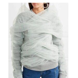 Y/Project grey cotton long-sleeved sweatshirt wrapped in light green tulle. Size XL (pictured on a size 8 mannequin). New & unworn with tags; the tulle might have come untacked in a couple of spots (it's very hard to tell), but in overall very good condition. As seen on Jimin from BTS.