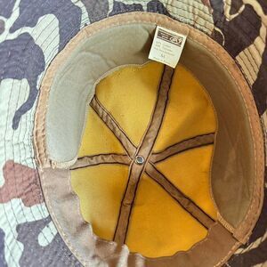 The product is a vintage YR camouflage duck deer hunting hat bucket cap, designed for men who enjoy hunting with a camo pattern. This lined size Medium hat is perfect for outdoor activities with its packable design and brim feature. This classic hunting-themed accessory is a stylish and functional addition to any outdoor enthusiast's wardrobe.