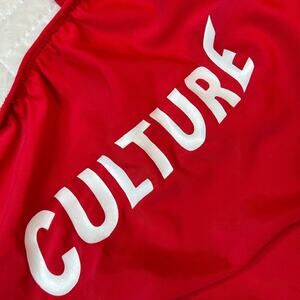 Color/Pattern: solid red with white logo at the lower back “culture” on the front