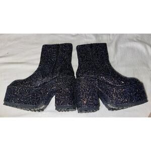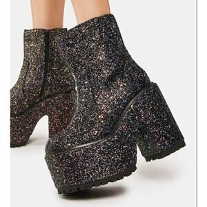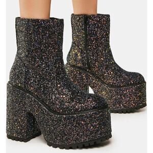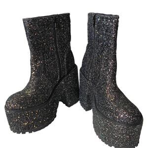 Sparkling glitter design. Chunky platform heel. Side zipper closure. Perfect for a night out.