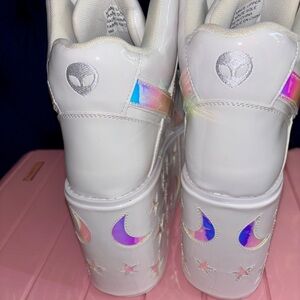 BRAND NEW WITHOUT BOX! The YRU Qozmo Moon Star Platform Sneakers are stylish women's platforms perfect for those looking to make a statement. With a platform height of 3 inches and an ultra-high heel, these lace-up sneakers feature a cool moon and stars theme, making them a standout choice. Made from vegan leather, these white sneakers are not only trendy but also cruelty-free, making them a great option for those conscious about their fashion choices. The YRU brand ensures quality and style in every pair of these unique sneakers.