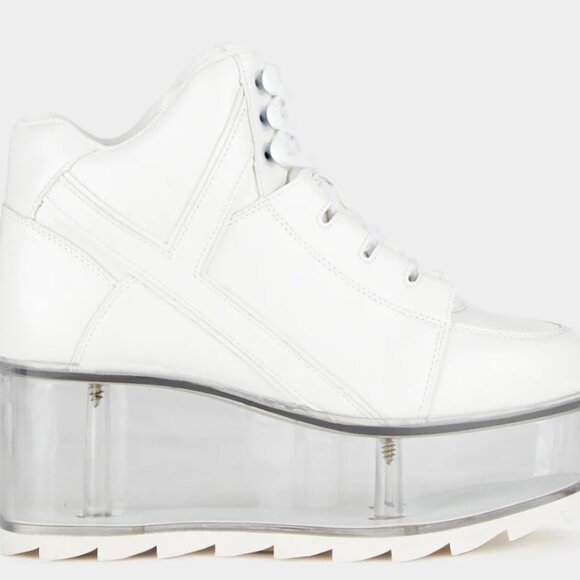 These vegan leather platform sneakers have adjustable lace-up closures, thick treaded soles, and a clear plastic bottom with a velcro food bed opening to insert toys, candy, or whateva fun stuff