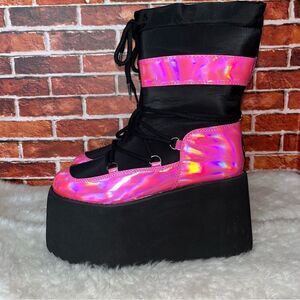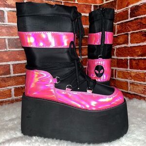 Y.R.U. Pink Holographic Qronic Winter Boots NIB Black Alien on Heels Back Zip 7