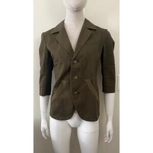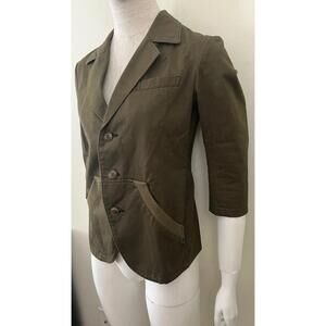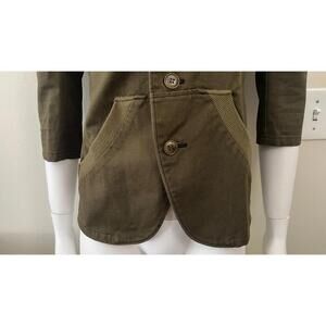 Y'S YOHJI YAMAMOTO GREEN ARMY JACKET IN A MARKED SIZE YOHJI 1- FITS A SMALL FINE. THE JACKET FEATURES A 3 BUTTON CLOSURE WITH A KNIT TRIM AT THE POCKETS WITH A ROUNDED HEM AND SINGLE CHEST POCKET, 3/4 SLEEVES IN A THICK COTTON THAT FEELS LIKE DENIM.