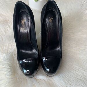 Beautiful pumps by YSL. These are made of black suede with a patent leather capped toe. There is a hidden platform for comfort and stiletto heels. The front of the shoes have two stitches. Great to wear to an event or going out.