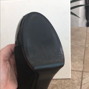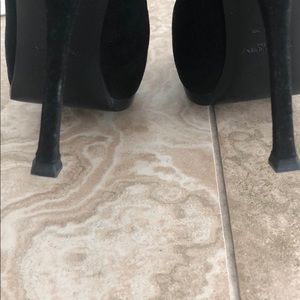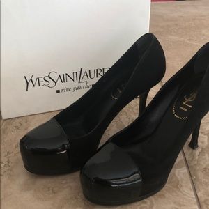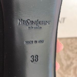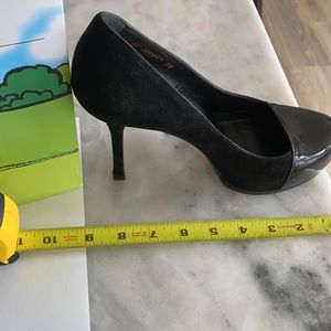 Yves Saint Laurent black suede leather with a black patented leather tip, shorter heels. Perfect for work or going out. Went to work with them 1x ( see pictures) Made in Italy 🇮🇹.