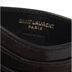 YSL Cassandre card case in crocodile-embossed leather. Dimensions are 4” x 3” and features large YSL logo in gold-tone hardware. Features five card slots and is made of calf leather throughout. Made in Italy. Comes with YSL dustbag. Retails $380.
