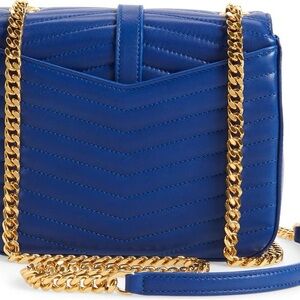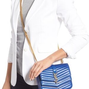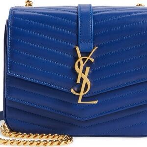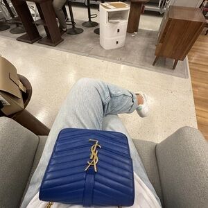 Stylish blue quilted crossbody bag with gold YSL logo. Perfect for any occasion.
