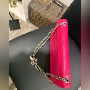 Chic fuchsia croc-embossed clutch with elegant chain detail. Perfect for evening outings. In great condition silver/gunmetal hardware.