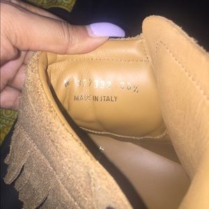 Tan, suade lace up sneakers with fringe cut design in back. Worn only one time.