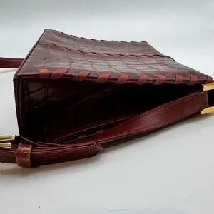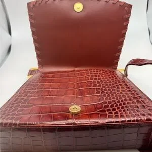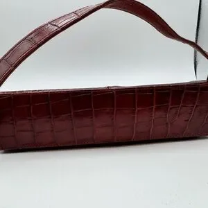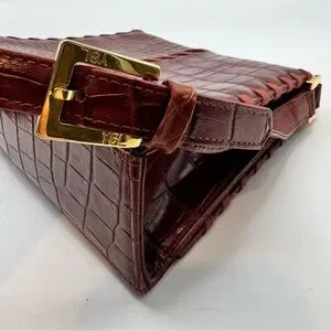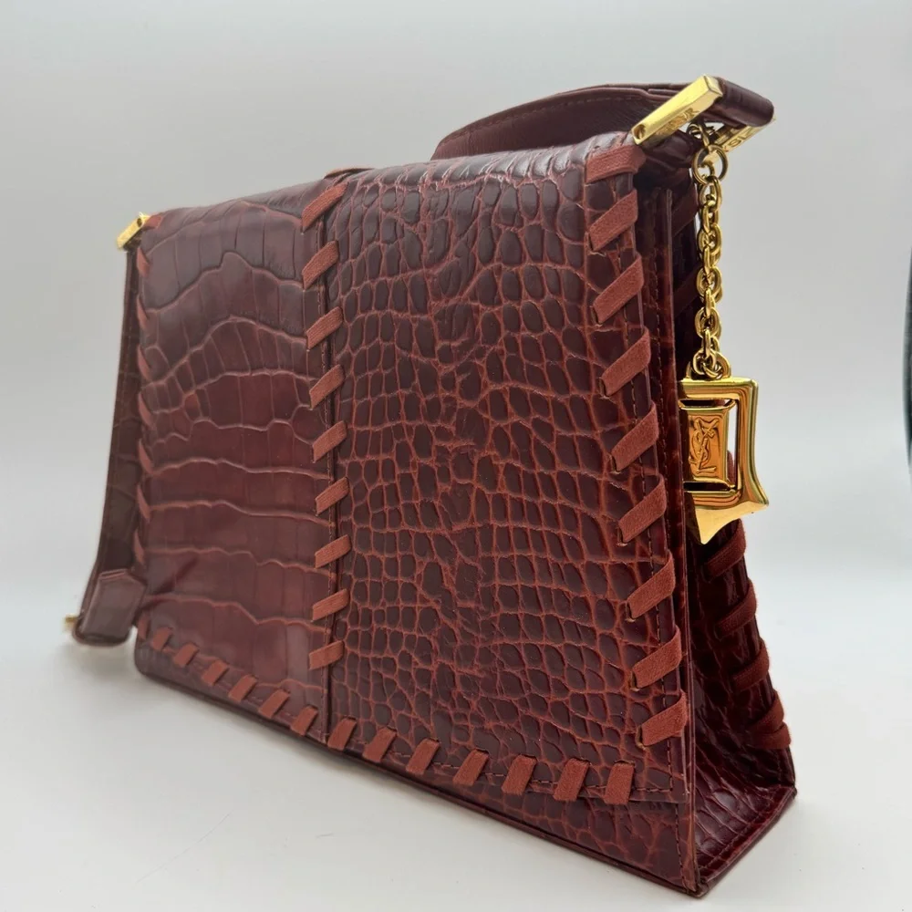YSL Croc Embossed Whipstitch Baguette Shoulder Bag Cognac Gold Hardware