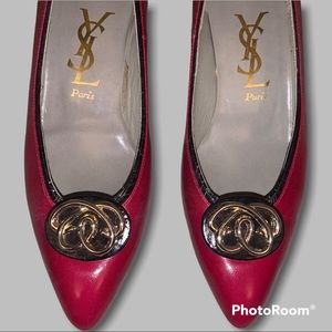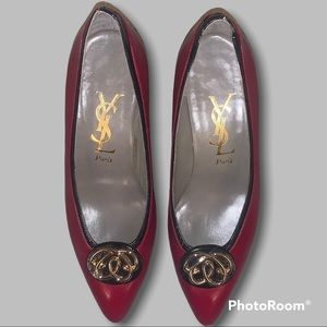 Dark Red Wine and black leather low pumps, featuring gold hardware detail from Yves Saint Laurent. These Pumps feature an intriguing detail with gold hardware on the front near the round toe. It has a low pointed heel, branded insole and leather outsole.