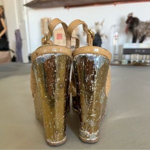 Leather lined, Patent leather outer, Metallic faux cork wedge, Platform, Slingback, Adjustable ankle strap
