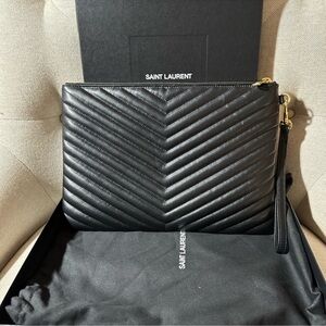 This Saint Laurent clutch showcases a sophisticated black leather exterior with a striking chevron quilted pattern. The gold-toned YSL logo adds a touch of luxury, making it a perfect accessory for elegant occasions. Its sleek design and wristlet strap offer both style and convenience. Comes with dust bag and original YSL box.