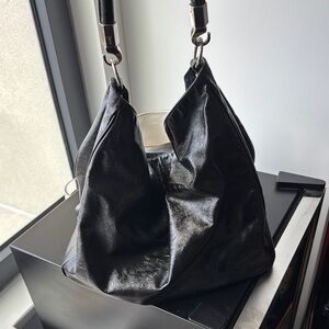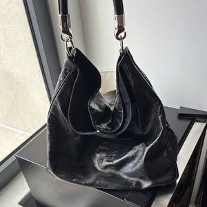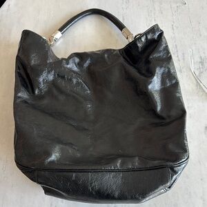 This elegant black patent leather tote bag is perfect for any occasion. Its sleek design and gorgeous soft patent leather make it a must-have accessory. It’s roomy enough to carry a days worth of items but when less full hangs beautifully. A large inside zip pocket and two cell phone or credit card slot pockets.