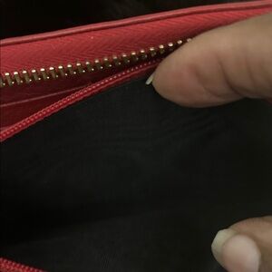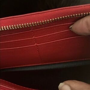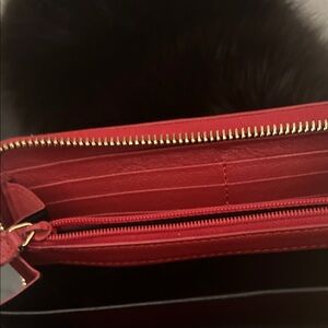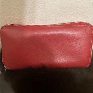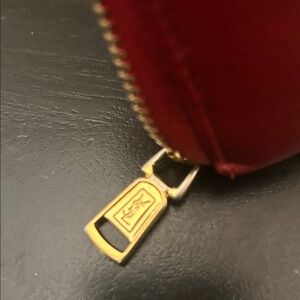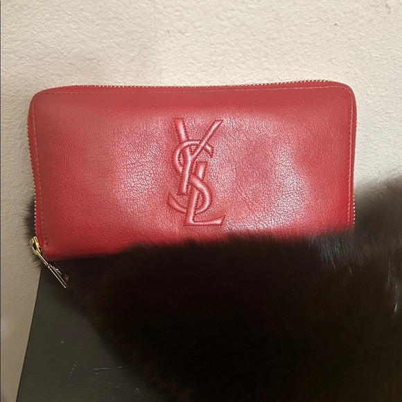 YSL red leather wallet with embossed logo. Sleek and stylish design.. Gold tone accented zipper. Multiple card slots and bill compartment. Very clean in very good condition. Dimensions are approximately 4”Hx8”L. Please see pictures. All reasonable offers considered.