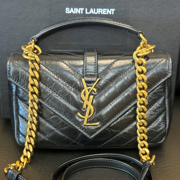 YSL SAINT LAURENT COLLEGE MINI CHAIN BAG IN SHINY CRACKLED LEATHER BLACK