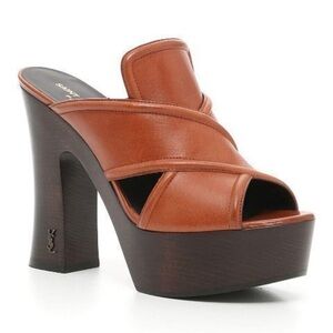 Saint Laurent leather Tucson sandals with crisscrossing bands on the front and tongue. Wood platform and heel, interlocking YSL metal logo on the heel, leather lining and rubber sole.