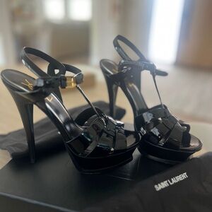 Only worn once. Pristine condition. Box included. Price on YSL website is $1150 plus tax. Almost new. These Saint Laurent heels feature a sleek black design with a high stiletto heel and intricate strappy detailing. The adjustable ankle strap ensures a secure fit, while the platform adds both height and comfort. Perfect for making a statement at any elegant event.