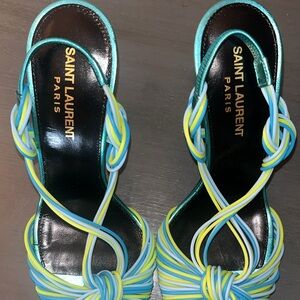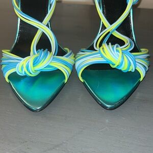 Elegant strappy heels with a vibrant teal and yellow design. Perfect for adding a pop of color.