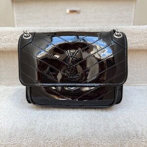 YSL Saint Laurent Patent Matelasse Monogram Medium Niki Chain Satchel Black