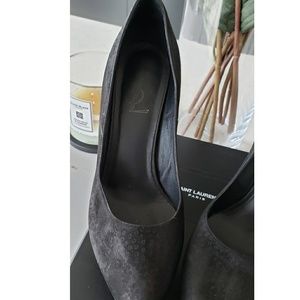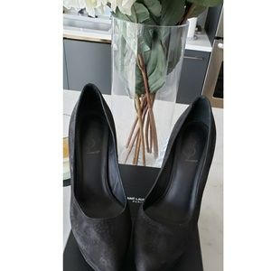Black suede Yves Saint Laurent 4.5 inch heels, great for a staple, sophisticated, black platform shoe.