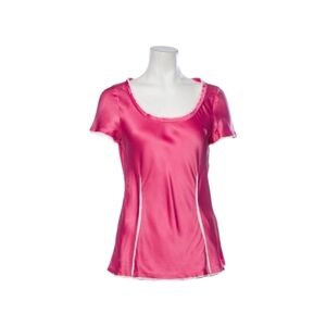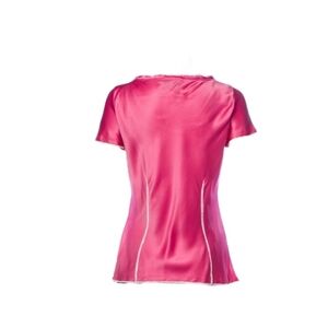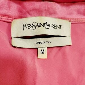 Yves Saint Laurent pink short-sleeved silk top designed with painted white stripes and hem. Perfect for the office or with jeans. Very good condition.
