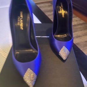 Crystal embellished toe and heel. Stunning cobalt blue satin. Never worn! New in box