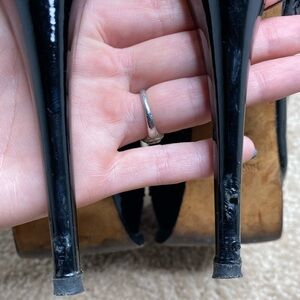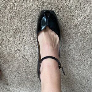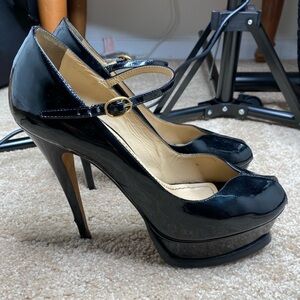 Great condition black patent leather platform heels. Mary Jane peep toe with beautiful black ankle strap. Lots of life left but there are a few marks on the heels and back of the shoe. See photo!