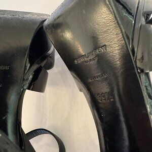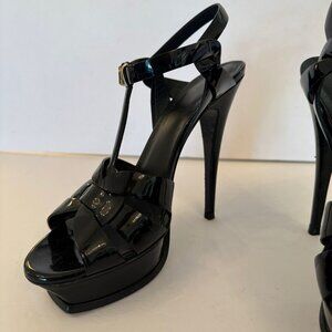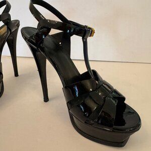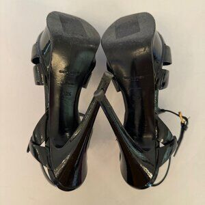 YSL Tribute Sandal in Blk Patent Leather in ok condition. The sole and insole show wear. The left heel is peeling.