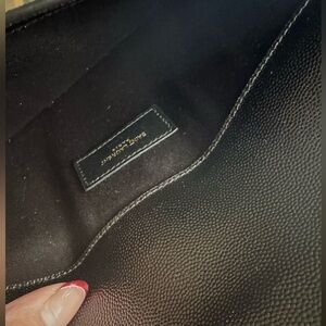 Elegant black clutch featuring a gold YSL logo. Perfect for evening events.