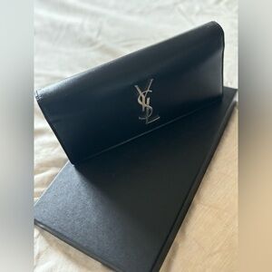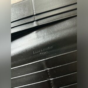 Black leather YSL wallet with several card compartments , two bills compartments. Pre-owned Condition is excellent. Hardware is Silver