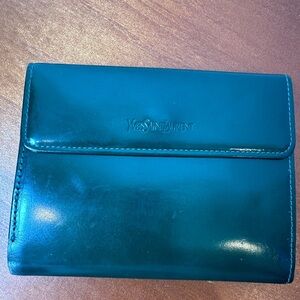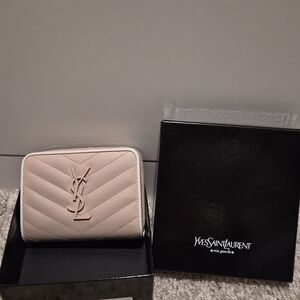 YSL Mini Wallet. All leather, gray exterior. Clean interior with lots of room. Beautiful gold hardware. Can add a chain to make her a crossbody. Never worn since I purchased. Lovely. Comes with box and cards. OPEN TO OFFERS!