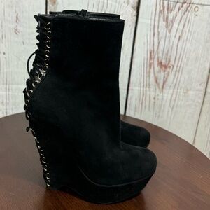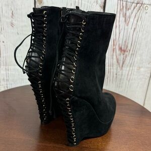 These are authentic SAINT LAURENT Suede Corset Wedge Boots size 37.5 in Black. These super sleek wedged heels are finely crafted of suede leather. They feature a suede leather corset 6inch heel, a 1.50 inch platform and a side zipper. These are excellent heels with the classic chic of Saint Laurent!