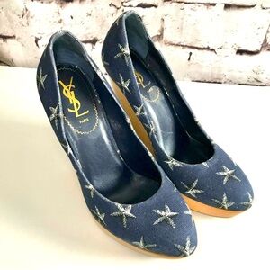 YSL YVES SAINT LAURENT Starfish Print Canvas Platform Wedge Size 9.5 US EU 39.5
