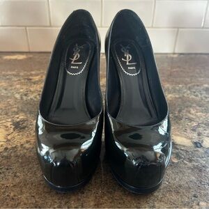 $795~YSL YVES SAINT LAURENT~Graphite Gray/Olive Green Patent Leather Tribtoo Tribute Concealed Platform Pumps~36/6