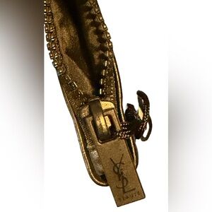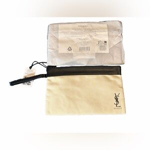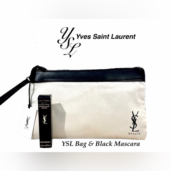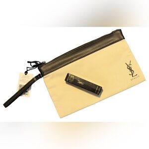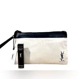 Elegant YSL Clutch / Wristlet / Makeup Bag in black vegan leather and cream canvas. Includes a sleek black mascara in the size 0.06 fl. oz. / 2 ml. Bag will fit your iPhone, keys and money.