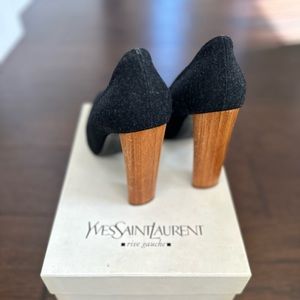 These YSL pumps are crafted from a black (in the YSL colour palette: "graphite") flannel material with a three sided wood block heel and a pointed toe.