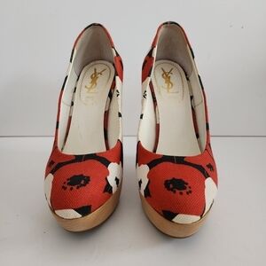 Beautiful and luxury Yves Saint Laurent Paris Poppy floral print canvas wood wedges.