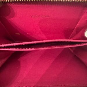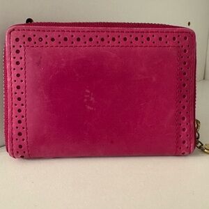 YSL leather wallet in a vibrant magenta color. Compact and stylish. Features a perforated design and gold-tone zipper pull.
