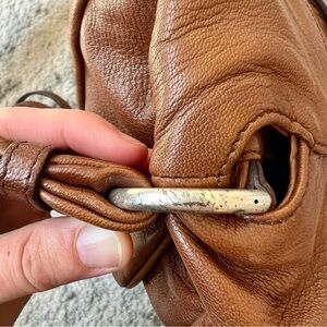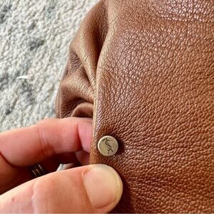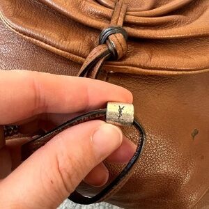 Thick leather shoulder strap is held with a large buckle accent on one end of the bag. The hardware is antiqued silver. Hardware is stamped YSL