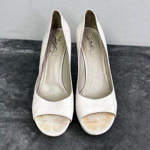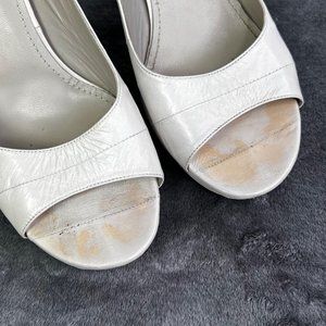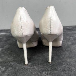 YSL Yves Saint Laurent peep toe leather pump in light gray/putty. Good condition with some wear on the back of one heel and some discoloring on the foot bed where the toes sit and a few areas on the shoe. Size 38 or US 8. Heel is approx 4-3/8" tall.