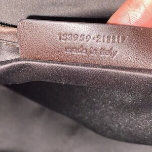 Features two flat leather top handles, hanging clochette, key and polished brass hardware