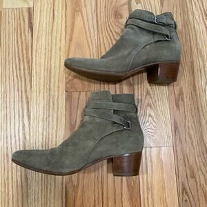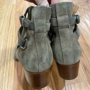 Suede fabric with nice texture. Adjustable wrap around straps. Slightly pointed but still rounded toe. Heel is just under 3 inches. Very gently worn. I’m being very picky but there might be a little dye transfer from blue jeans. I show what I’m seeing in the last 3 pics. Over all the color and fabric are a tan with a touch of green. It’s the type of color that tends to vary so any possible discoloration is really hard to determine.