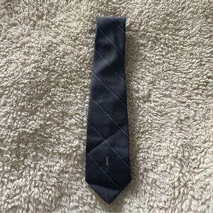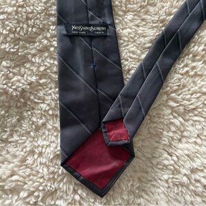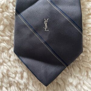 Stitched YSL and navy blue and silver stripes on this Yves Saint Laurent gray tie.