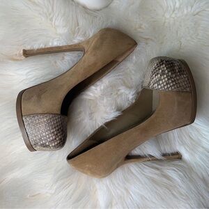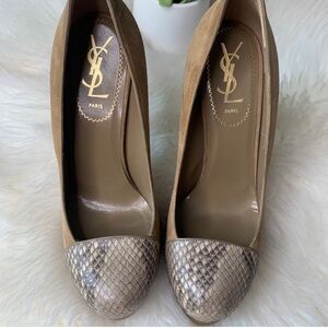 tunning classic YSL Tribute Too pumps.These are made of beautiful suede leather with a python capped toe.The heels are stunning stilettos and there is a very high internal platform for comfort