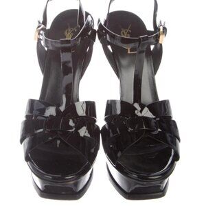 Black patent leather Yves Saint Laurent Tribute platform sandals with gold-town buckle closure at ankle straps and covered heels. Signs of wear on soles and scuffing on exterior of shoes.