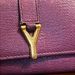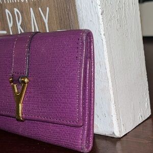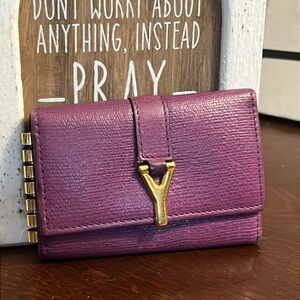 Absolutely adorable 100% authentic YSL Yves Saint Laurent "Y" logo leather tri-fold keychain holder case. Inside has an open pocket and 6 key rings. It is approximately 3 1/2" wide x 2" high. All leather inside. Gold hardware, still in excellent condition. Shows minimal signs of wear mainly tiny faint scratches on hardware.
